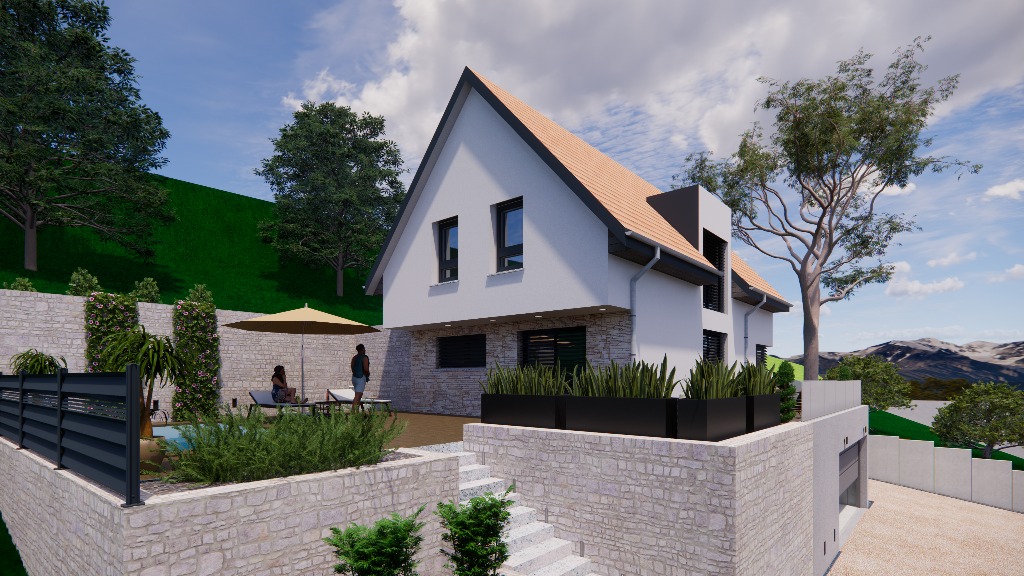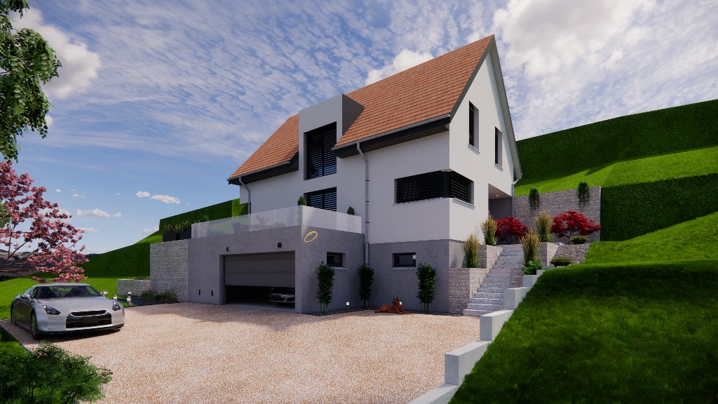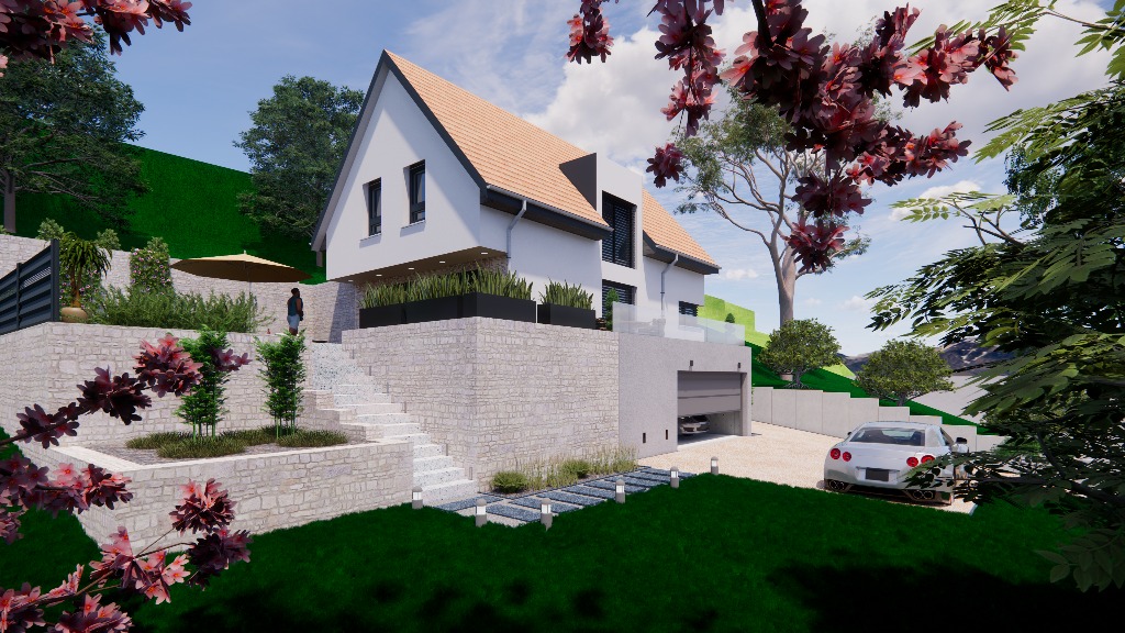 Maisons Atome à conçu le modèle HELIUM qui est parfaitement adapté pour les terrains en pentes.
